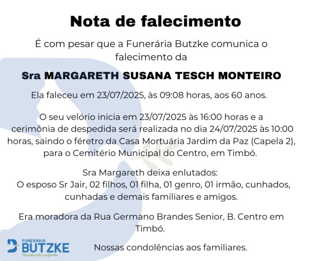 Notas de Falecimento – 23/07/2025 Julho 23, 2025 0 Por Redação Whatsapp Share Post Share Pinterest A FAMÍLIA NOSSO SENTIMENTO E CONFORTO ——————— OUTRAS NOTAS ACESSE https://bit.ly/2YDELw3 Matérias Relacionadas: Notas de Falecimento – 07/06/2025 Notas de Falecimento – 09/06/2025 Notas de Falecimento – 30/06/2025 Notas de Falecimento – 08/07/2025 Notas de Falecimento – 16/07/2025 Rodeio recebe visita do Governador Jorginho Mello Hospital Oase – Residência Multiprofissional: uma jornada de cuidado, conhecimento e transformação