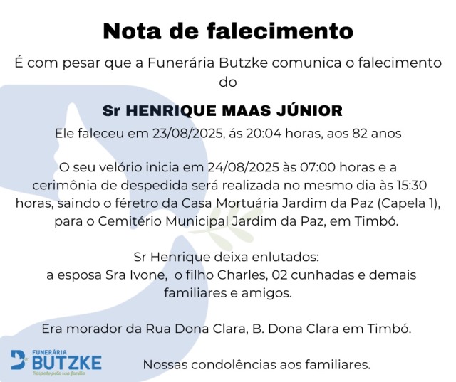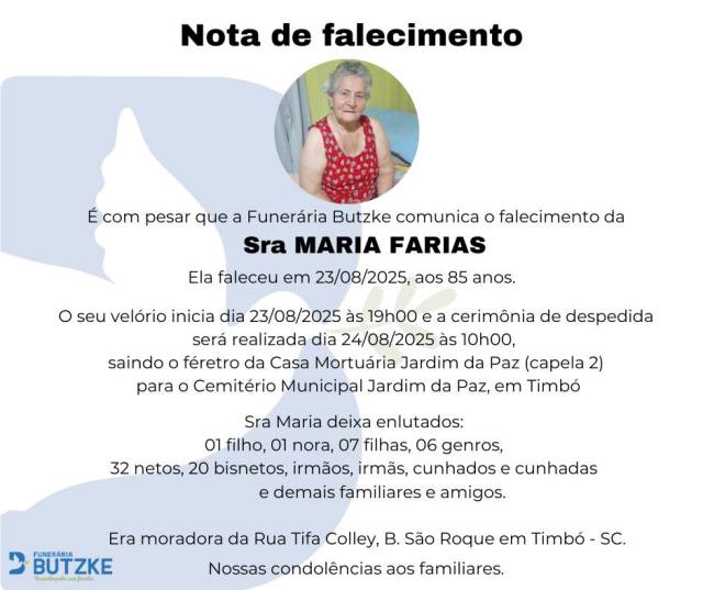 Notas de Falecimento – 23/08/2025 Agosto 23, 2025 0 Por Redação Whatsapp Share Post Share Pinterest A FAMÍLIA NOSSO SENTIMENTO E CONFORTO ——————— OUTRAS NOTAS ACESSE https://bit.ly/2YDELw3 Matérias Relacionadas: Notas de Falecimento – 21/06/2025 Notas de Falecimento – 27/07/2025 Notas de Falecimento – 08/08/2025 Notas de Falecimento – 10/08/2025 Notas de Falecimento – 15/08/2025 Notas de Falecimento – 20/08/2025 Notas de Falecimento – 22/08/2025 BRDE contempla APAE de Blumenau via lei de incentivos em 2024 e seguem juntos pela Inclusão e Saúde Problemas no sistema de telemetria afetam abastecimento de água em bairros de Timbó neste sábado