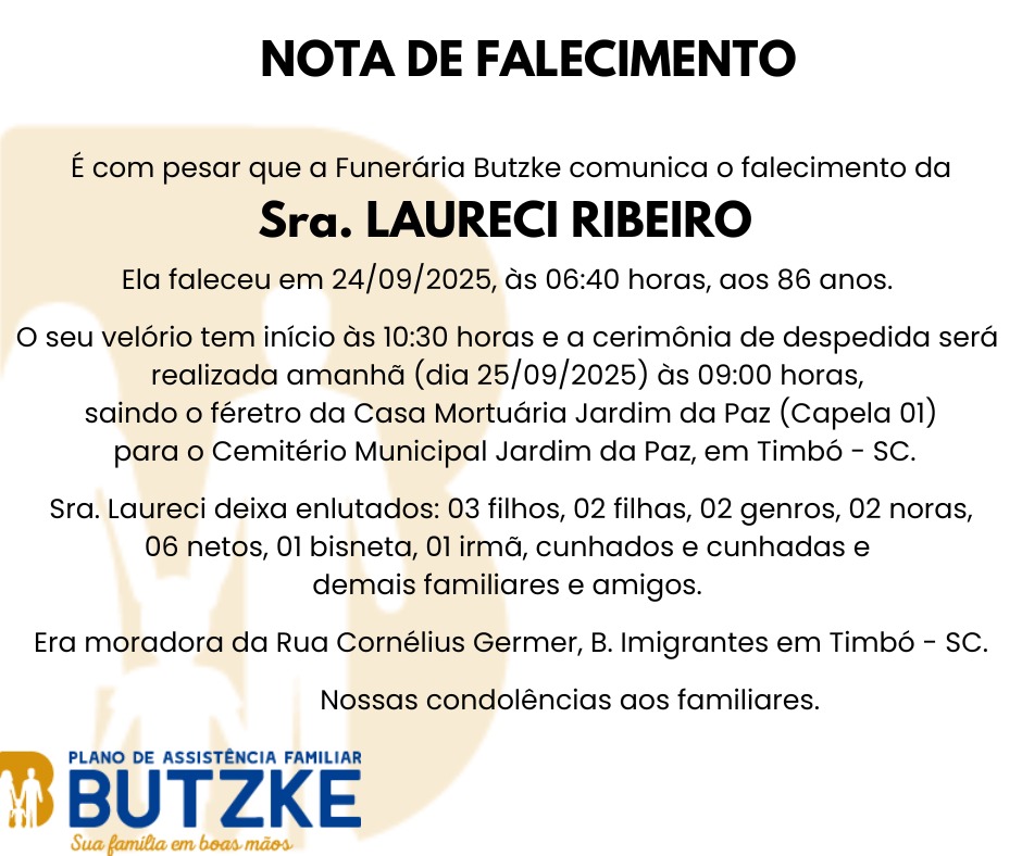 Notas de Falecimento – 24/09/2025 Setembro 24, 2025 0 Por Redação Whatsapp Share Post Share Pinterest A FAMÍLIA NOSSO SENTIMENTO E CONFORTO ——————— OUTRAS NOTAS ACESSE https://mla.bs/4a87181d Matérias Relacionadas: Notas de Falecimento – 13/06/2025 Notas de Falecimento – 27/06/2025 Notas de Falecimento – 29/06/2025 Notas de Falecimento – 03/07/2025 Notas de Falecimento – 09/07/2025 Notas de Falecimento – 15/07/2025 Notas de Falecimento – 02/08/2025 Notas de Falecimento – 14/08/2025 Notas de Falecimento – 18/08/2025 Notas de Falecimento – 25/08/2025 Notas de Falecimento – 26/08/2025 Notas de Falecimento – 19/09/2025 Novo presidente da IGR Vale Europeu cumpre agenda em Florianópolis para fortalecer o turismo catarinense Suspeito de feminicídio em Timbó se cala na delegacia após confessar crime à Polícia Militar