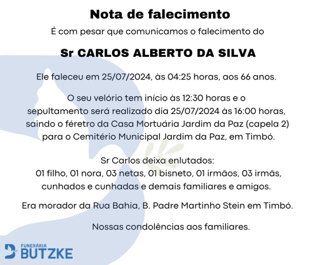 Notas de Falecimento – 25/07/2024 Julho 25, 2024 0 Por Redação Whatsapp Share Post Share Pinterest A FAMÍLIA NOSSO SENTIMENTO E CONFORTO——————— OUTRAS NOTAS ACESSE https://bit.ly/2YDELw3 Matérias Relacionadas:No related posts. Eleições 2024 – Novidade nas Eleições em Rodeio Selecionados de Rio do Sul avançam no ‘Santa Catarina Canta’ e garantem vaga na mesorregional do Vale do Itajaí