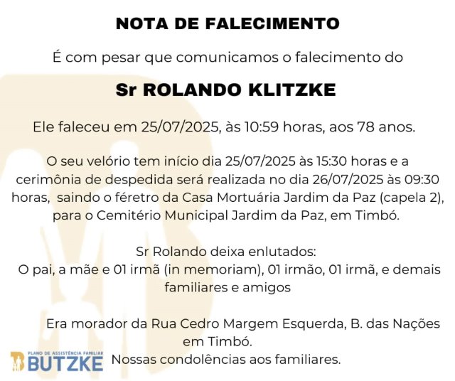 Notas de Falecimento – 25/07/2025 Julho 25, 2025 0 Por Redação Whatsapp Share Post Share Pinterest A FAMÍLIA NOSSO SENTIMENTO E CONFORTO ——————— OUTRAS NOTAS ACESSE https://bit.ly/2YDELw3 Matérias Relacionadas: Notas de Falecimento – 12/06/2025 Notas de Falecimento – 20/06/2025 Notas de Falecimento – 24/06/2025 Notas de Falecimento – 28/06/2025 Notas de Falecimento – 29/06/2025 Notas de Falecimento – 10/07/2025 Telemedicina aproxima médicos e pacientes em Santa Catarina e muda a rotina do cuidado médico Justiça decreta prisão preventiva de caminhoneiro envolvido em colisão fatal na BR-470