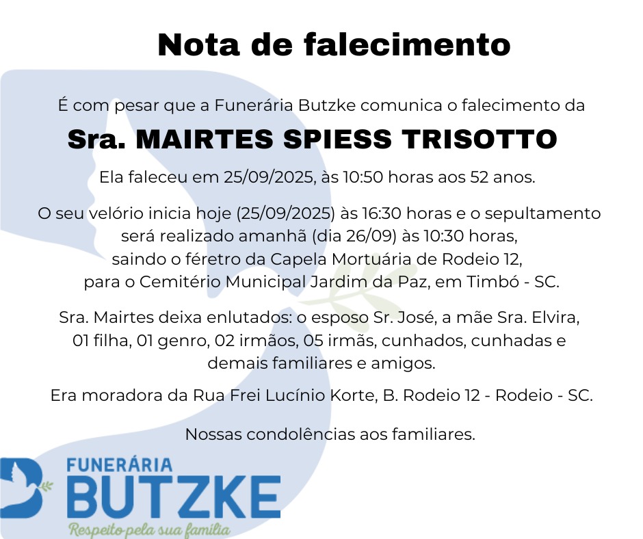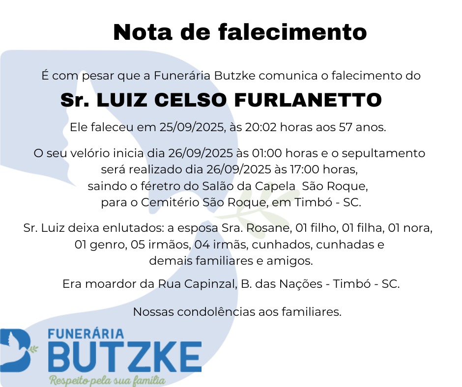 Notas de Falecimento – 25/09/2025 Setembro 25, 2025 0 Por Redação Whatsapp Share Post Share Pinterest A FAMÍLIA NOSSO SENTIMENTO E CONFORTO ——————— OUTRAS NOTAS ACESSE https://mla.bs/4a87181d Matérias Relacionadas: Notas de Falecimento – 12/06/2025 Notas de Falecimento – 20/06/2025 Notas de Falecimento – 24/06/2025 Notas de Falecimento – 28/06/2025 Notas de Falecimento – 29/06/2025 Notas de Falecimento – 10/07/2025 Notas de Falecimento – 01/08/2025 Notas de Falecimento – 02/08/2025 Notas de Falecimento – 14/08/2025 Notas de Falecimento – 16/08/2025 Notas de Falecimento – 22/08/2025 Notas de Falecimento – 25/08/2025 Notas de Falecimento – 22/09/2025 Ana Paula Lima destaca novas máquinas e investimentos do governo Lula para a agricultura catarinense Doenças cardíacas causam cerca de 800 mortes por dia no Brasil