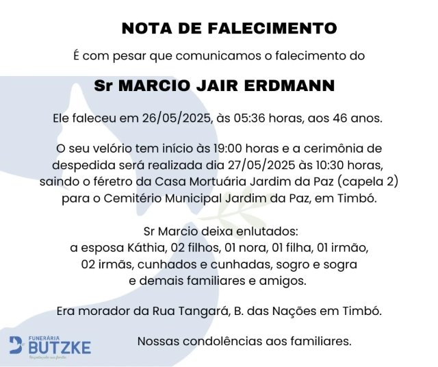 Notas de Falecimento – 26/05/2025 Maio 26, 2025 0 Por Redação Whatsapp Share Post Share Pinterest A FAMÍLIA NOSSO SENTIMENTO E CONFORTO ——————— OUTRAS NOTAS ACESSE https://bit.ly/2YDELw3 Matérias Relacionadas:No related posts. Definidos municípios que receberão as próximas edições do Alesc Itinerante Emissão do CCIR 2025 começa no dia 17 de junho em Timbó