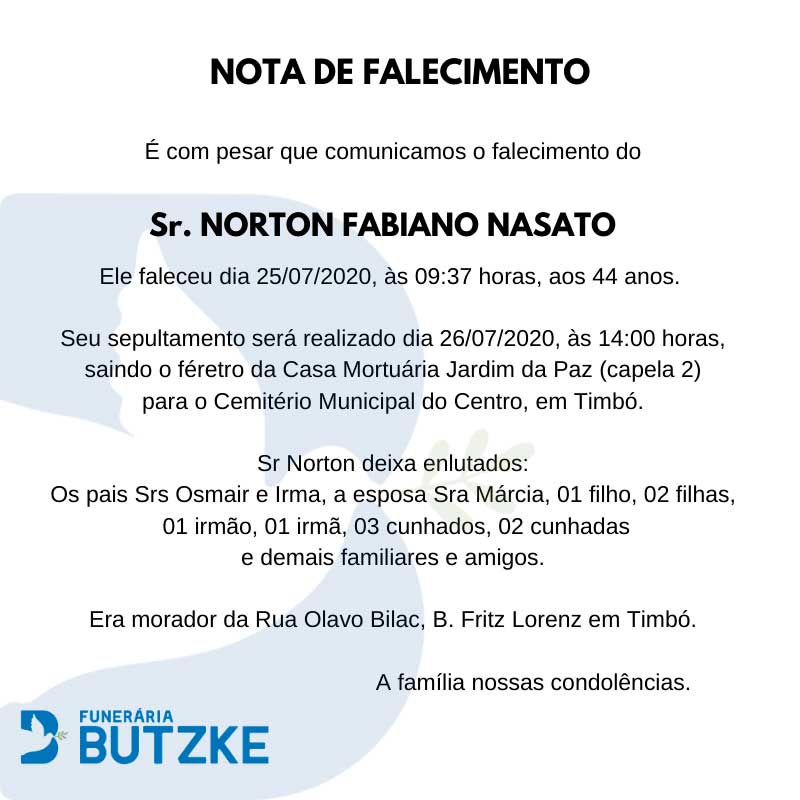 Notas de Falecimento – 26/07/2020 Julho 26, 2020 0 Por Redação Whatsapp Share Post Share Pinterest Matérias Relacionadas:No related posts. Decreto estabelece novas medidas e prevenção e combate à Covid-19 em Timbó Notas de Falecimento – 27/07/2020