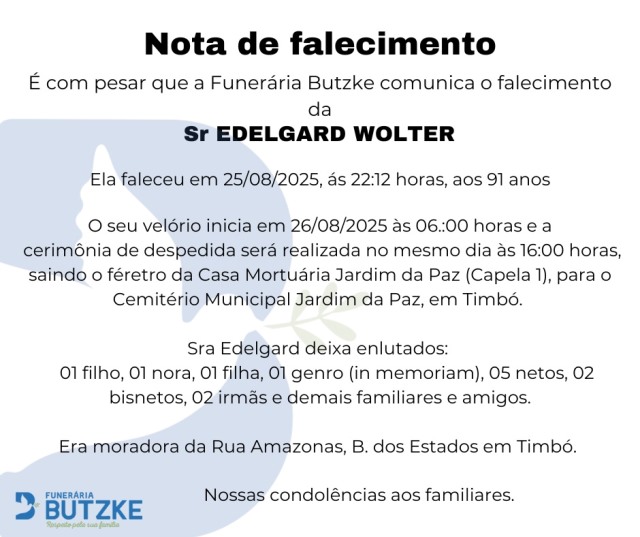 Notas de Falecimento – 26/08/2025 Agosto 26, 2025 0 Por Redação Whatsapp Share Post Share Pinterest A FAMÍLIA NOSSO SENTIMENTO E CONFORTO ——————— OUTRAS NOTAS ACESSE https://bit.ly/2YDELw3 Matérias Relacionadas: Notas de Falecimento – 12/06/2025 Notas de Falecimento – 21/06/2025 Notas de Falecimento – 27/07/2025 Notas de Falecimento – 08/08/2025 Notas de Falecimento – 10/08/2025 Notas de Falecimento – 15/08/2025 Notas de Falecimento – 20/08/2025 Notas de Falecimento – 25/08/2025 Câmara de Blumenau – Empresas são ouvidas pela CPI sobre sistema de esgotamento sanitário e consultoria econômica
