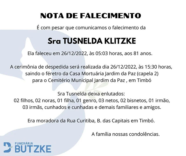 Notas de Falecimento – 26/12/2022 Dezembro 26, 2022 0 Por Redação Whatsapp Share Post Share Pinterest A FAMÍLIA NOSSO SENTIMENTO E CONFORTO——————— OUTRAS NOTAS ACESSE https://bit.ly/2YDELw3 Matérias Relacionadas:No related posts. Festa de Natal de Pomerode chega ao fim com público prestigiando show nacional FLORIANÓPOLIS VAI TER CONTAGEM REGRESSIVA INÉDITA NO RÉVEILLON