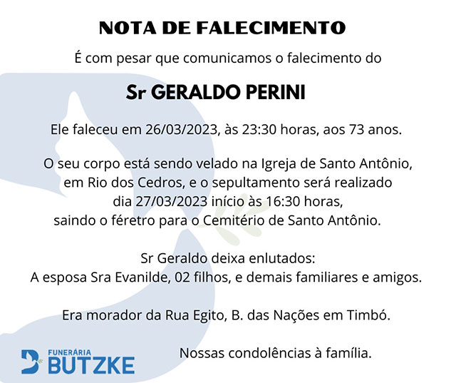 Notas de Falecimento – 27/03/2023 Março 27, 2023 0 Por Redação Whatsapp Share Post Share Pinterest A FAMÍLIA NOSSO SENTIMENTO E CONFORTO——————— OUTRAS NOTAS ACESSE https://bit.ly/2YDELw3 Matérias Relacionadas:No related posts. Prefeitura de Rodeio – Reconstruindo nossa Bella Cittá! Pomerode – Osterbaum com mais de 400 casquinhas de ovos vence concurso da Rota do Enxaimel