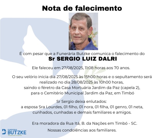 Notas de Falecimento – 27/08/2025 Agosto 27, 2025 0 Por Redação Whatsapp Share Post Share Pinterest A FAMÍLIA NOSSO SENTIMENTO E CONFORTO ——————— OUTRAS NOTAS ACESSE https://bit.ly/2YDELw3 Matérias Relacionadas: Notas de Falecimento – 07/06/2025 Notas de Falecimento – 30/06/2025 Notas de Falecimento – 08/07/2025 Notas de Falecimento – 16/07/2025 Notas de Falecimento – 23/07/2025 Notas de Falecimento – 25/07/2025 Notas de Falecimento – 07/08/2025 Notas de Falecimento – 21/08/2025 Notas de Falecimento – 24/08/2025 Câmara de Blumenau – Empresas são ouvidas pela CPI sobre sistema de esgotamento sanitário e consultoria econômica Ignorância deliberada e autismo: o silêncio que exclui