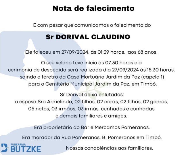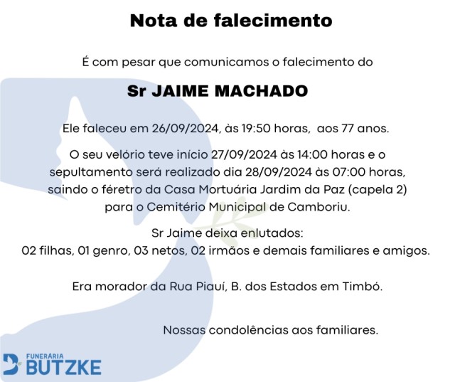 Notas de Falecimento – 27/09/2024 Setembro 27, 2024 0 Por Redação Whatsapp Share Post Share Pinterest A FAMÍLIA NOSSO SENTIMENTO E CONFORTO——————— OUTRAS NOTAS ACESSE https://bit.ly/2YDELw3 Matérias Relacionadas:No related posts. Festival Paralímpico de Timbó reúne 50 atletas de cinco cidades Eleições 2024 – Marchetti recebe apoio de João Rodrigues e Napoleão Bernardes
