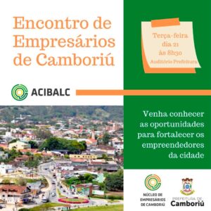 Para aproximar a classe empresarial e fomentar novas oportunidades de negócio, o Núcleo de Empresários de Camboriú da Acibalc, em parceria com a Prefeitura de Camboriú, promove no próximo dia 21, um Encontro de Empresários no município. Podem participar associados e não associados da entidade, que queiram fortalecer o empreendedorismo na cidade. O evento será presencial e realizado no Auditório da Prefeitura, a partir das 8h30.