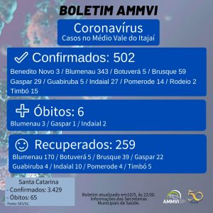 Até o momento, 10 municípios do Médio Vale apresentam casos positivos para o novo coronavírus. Os óbitos foram registrados um em Gaspar, dois em Indaial e três em Blumenau. Dentre os recuperados, estão cidadãos de Blumenau (170), Botuverá (5), Brusque (39), Gaspar (22), Guabiruba (4), Indaial (10), Pomerode (4), Timbó (5).