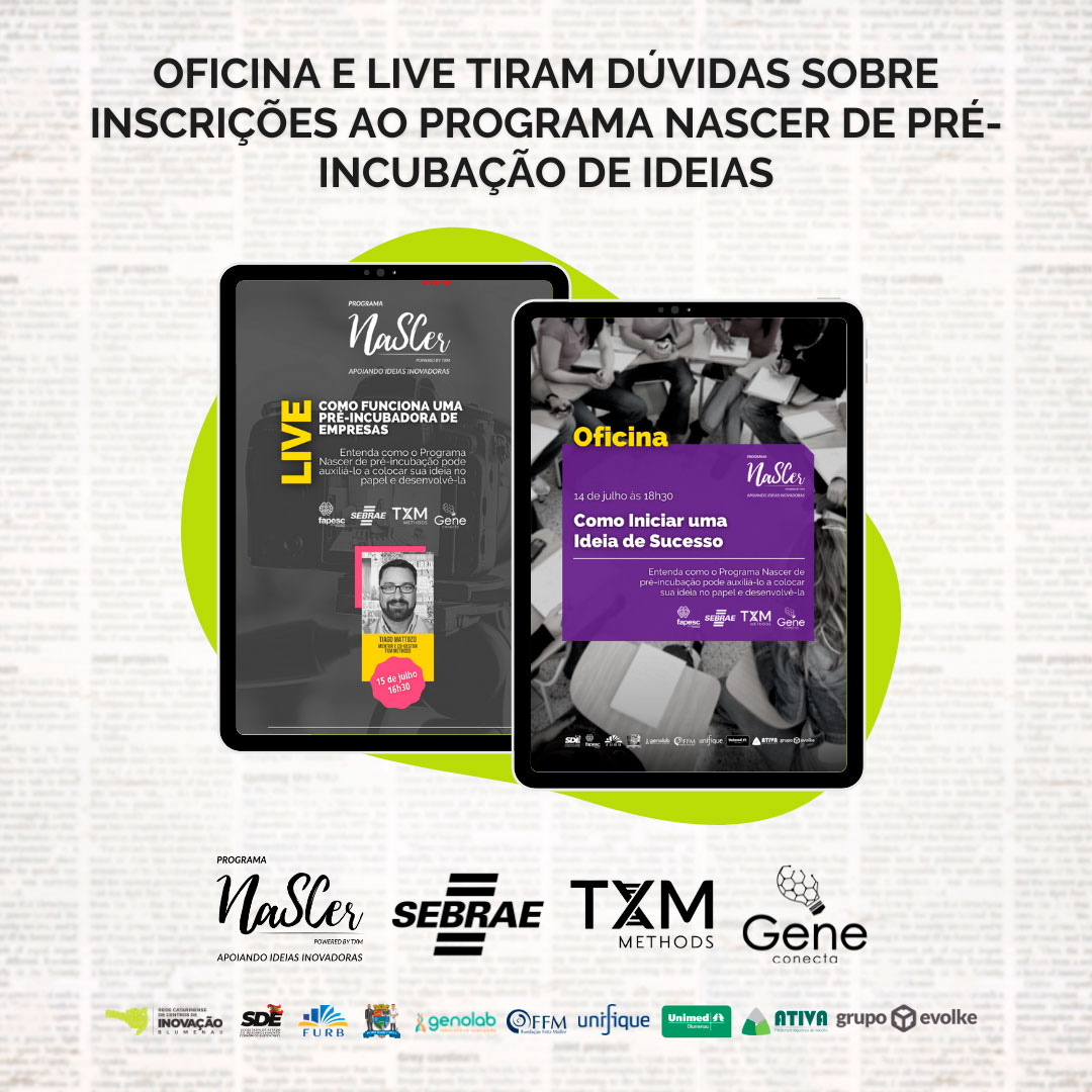 O Instituto Gene e o Centro de Inovação Blumenau (CIB) estão organizando duas atividades para tirar dúvidas sobre o Programa Nascer de Pré-Incubação de Ideias. A primeira será uma oficina presencial, no CIB, e a segunda, uma live com o mentor e co-gestor da TXM Methods.
