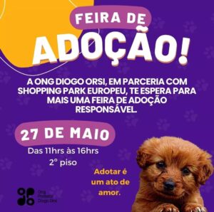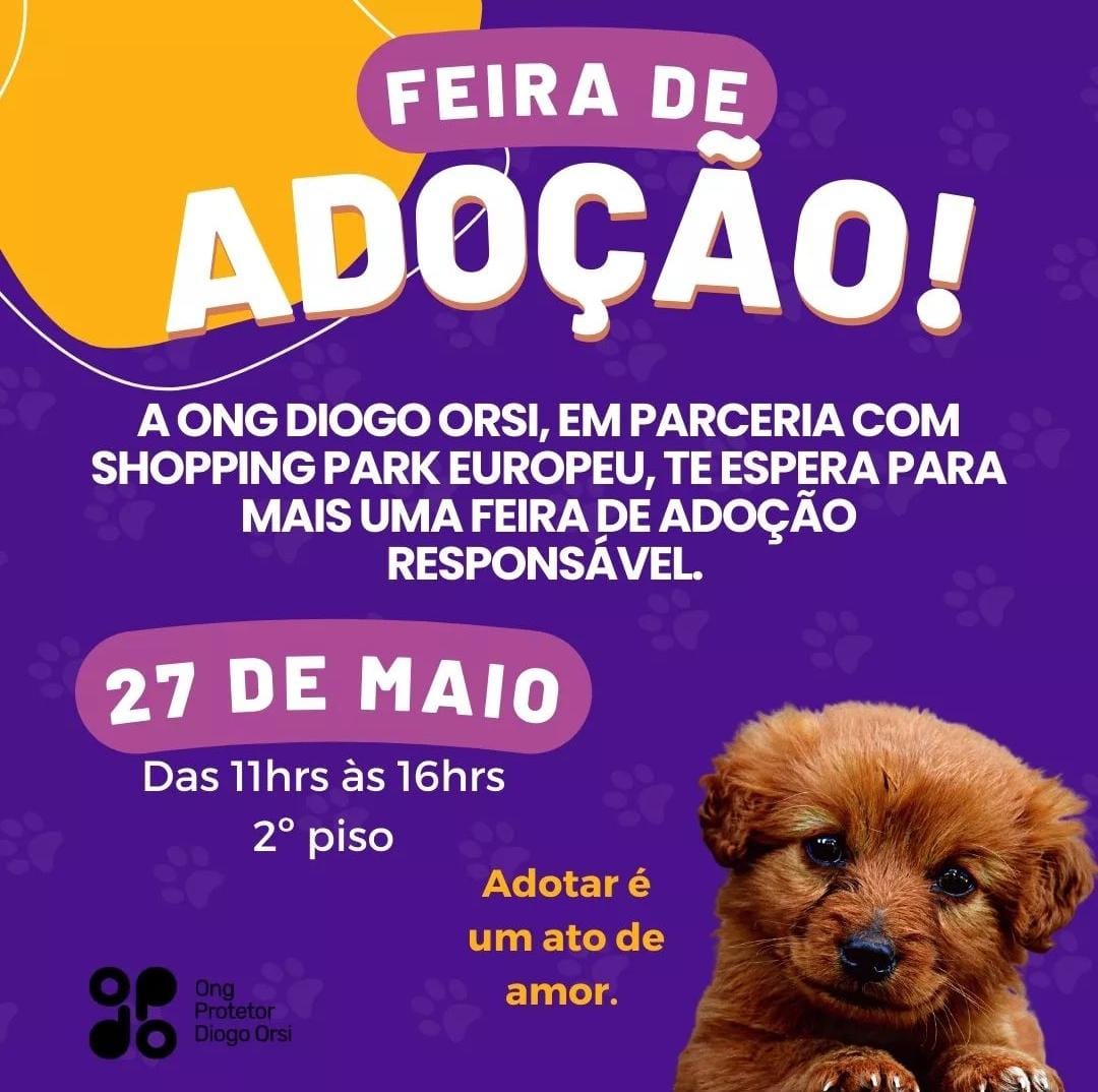 Oportunidade única para quem está em busca de um pet! Neste sábado, dia 27 de maio, a partir das 11h, a ONG Diogo Orsi, realizará uma feira de adoção de filhotes na Praça Pet do Shopping Park Europeu, em Blumenau. O evento tem o intuito de promover a conscientização sobre a importância da castração e da adoção responsável, além disto, a feira ainda pretende encontrar lares amorosos para esses animais indefesos.