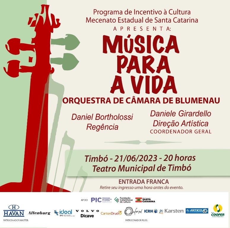 Na quarta-feira, dia 21 de junho, a Orquestra de Câmara de Blumenau se apresenta a partir das 20h, no Teatro Municipal de Timbó. A orquestra apresentará o segundo repertório do projeto “Música para a Vida”. A entrada será gratuita, com a retirada dos ingressos uma hora antes do concerto.