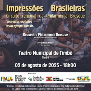 Impressões Brasileiras se baseia na obra musical ‘9 Miniaturas Brasileiras para Orquestra’ de autoria do nosso diretor musical Sérgio Luiz Westrupp. Este espetáculo estreou em Brusque no dia 09 de junho de 2024 e percorreu cinco bairros do município. Neste ano a Orquestra Philarmonia Brusque, juntamente com o ator David Matias Krause, se prepara para realizar mais um Circuito Regional que irá contemplar Brusque, Balneário Camboriú, Timbó e Blumenau.