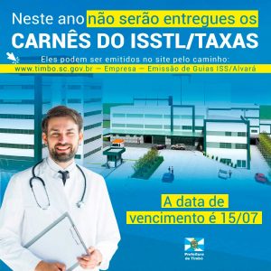 Julho 8, 2020Neste ano, devido à situação do Coronavírus, não serão entregues carnês do ISSTL/Taxas. Pela mesma razão a data de vencimento do imposto também foi prorrogada para o dia 15 de julho, próxima quarta-feira. Você pode emitir seu carnê através do site oficial da Prefeitura de Timbó, acessando o link https://is.gd/yl6gX4. Quem não tiver acesso à internet pode vir até na Prefeitura de Timbó e retirar seu carnê na Central de Atendimento. O horário é das 8h às 17h, sem fechar para o almoço.