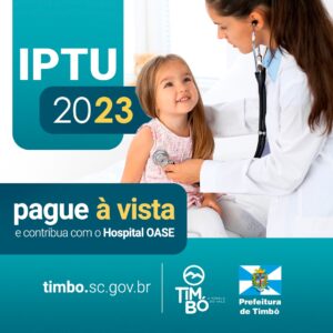 Como nos últimos anos, o IPTU à vista é mais saúde para Timbó. Nos pagamentos à vista, 10% do valor será revertido para obras do novo prédio do Hospital Oase, mais moderno e acolhedor.