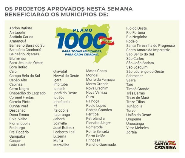 Em mais uma etapa do Plano 1000, nesta semana, o Governo do Estado firmou compromisso de repassar R$ 245,3 milhões para 143 projetos em 90 municípios de Santa Catarina. As obras incluem pavimentações, construções de pontes, recuperações, ampliações, reformas, investimentos na agricultura, entre outros.
