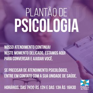 Abril 16, 2020Nesse momento, o apoio psicológico pode ser ainda mais essencial para você. Pensando na saúde mental e emocional da comunidade, os psicólogos que atuam na rede pública de Timbó estão de plantão e continuam atendendo, mas de forma remota. Se você precisa de ajuda, é só ligar para a sua Unidade de Saúde que será feito o encaminhamento.