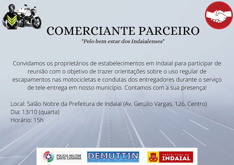 A Polícia Militar e o Departamento Municipal de Trânsito de Indaial convidam proprietários de estabelecimentos do Município que utilizam serviço de entrega através de motocicletas a participarem de uma reunião na próxima quarta-feira, 13 de outubro, às 15h, no Salão Nobre da Prefeitura (Av. Getúlio Vargas, 126, Centro).