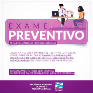Agora a mulher timboense tem mais um local onde pode realizar o exame de Prevenção do Câncer de Colo Uterino e solicitação de mamografias: na Policlínica de Referência, no período noturno. O novo serviço está dentro do Programa Saúde do Trabalhador.