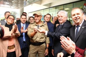 O presidente da Alesc, deputado estadual Moacir Sopelsa, e os demais deputados fizeram a entrega simbólica das chaves ao comandante-geral da PMSC, coronel Marcelo Pontes.