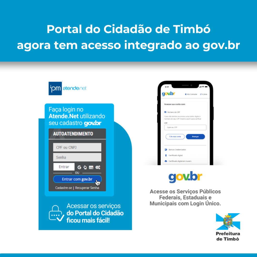 A Prefeitura de Timbó criou uma forma mais fácil de acesso ao Portal do Cidadão, com o login único do Governo Federal, pelo portal gov.br. A proposta facilita a identificação e autenticação do cidadão fornecendo um acesso unificado, reduzindo a burocracia.