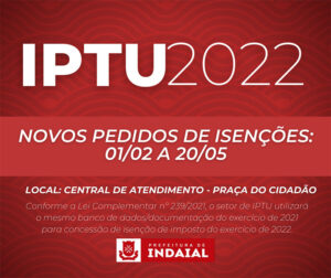 Os proprietários de imóveis em Indaial que têm interesse em solicitar a isenção do Imposto sobre a Propriedade Predial e Territorial Urbana (IPTU) devem ficar atentos ao prazo definido pela Prefeitura para fazer o pedido. O prazo para requerimento de isenção do IPTU 2022 será de 1º de fevereiro a 20 de maio. Interessados deverão procurar a Central de Atendimento da Prefeitura, localizada na Praça do Cidadão (rua Marechal Deodoro da Fonseca, 675, Tapajós, ao lado da Dokassa).