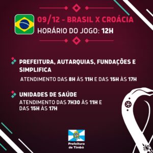 A Prefeitura de Timbó informa que os serviços municipais funcionarão em horário diferenciado nesta sexta-feira, dia 09 de dezembro, durante o jogo da Seleção Brasileira contra a Croácia, nas quartas de final da Copa do Mundo 2022.