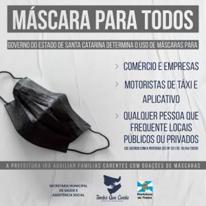 Importante lembrar que, para quem trabalha em comércios ou empresas de Timbó, o uso de máscaras é obrigatório. Para garantir que todos tenham acesso a esse item essencial, se mantendo protegidos e, também, prevenindo a saúde de quem está ao redor, as famílias que vivem em vulnerabilidade social na cidade irão receber essas máscaras do poder público.