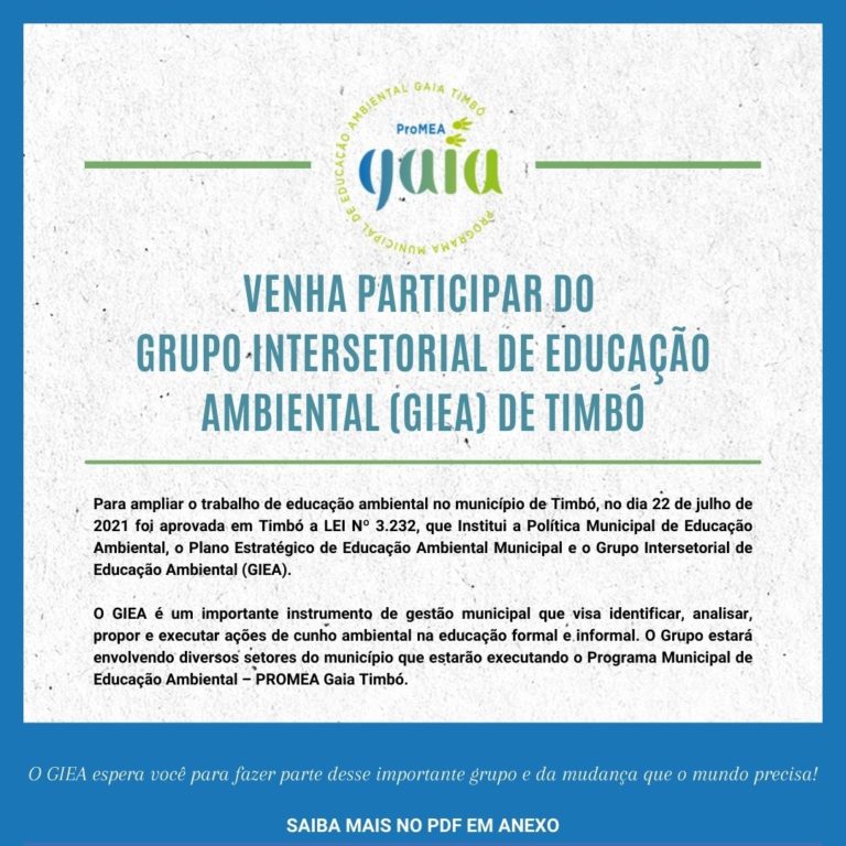 A Prefeitura de Timbó convida a população para participar do Grupo Intersetorial de Educação Ambiental (GIEA). Para ampliar o trabalho de educação ambiental no município de Timbó, no dia 22 de julho foi aprovada a Lei nº 3.232, que instituiu a Política Municipal de Educação Ambiental, o Plano Estratégico de Educação Ambiental Municipal e o GIEA.