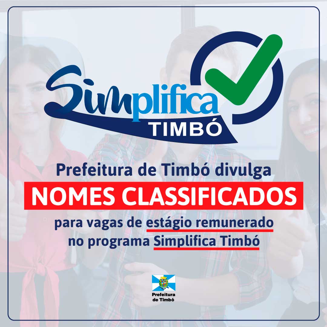 A Prefeitura de Timbó, por meio da Secretaria de Fazenda e Administração, torna pública a divulgação dos nomes classificados no Processo Seletivo Simplificado do Programa ‘Simplifica Timbó’ para ocupar a vaga de estágio remunerado para atuação na Central de Atendimento Simplifica Timbó. É possível conferir a lista de aprovados da segunda etapa e o cronograma da terceira etapa no link a seguir — https://is.gd/agny6l.