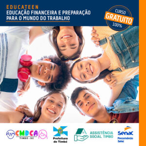 A Prefeitura de Timbó, por meio do Fundo da Infância e Adolescência (FIA), em parceria com o SENAC, está com inscrições abertas para o Programa EDUCATEEN – Educação Financeira e Preparação para o Mundo do Trabalho, programa gratuito de capacitação para os jovens do 9º ano do ensino fundamental.