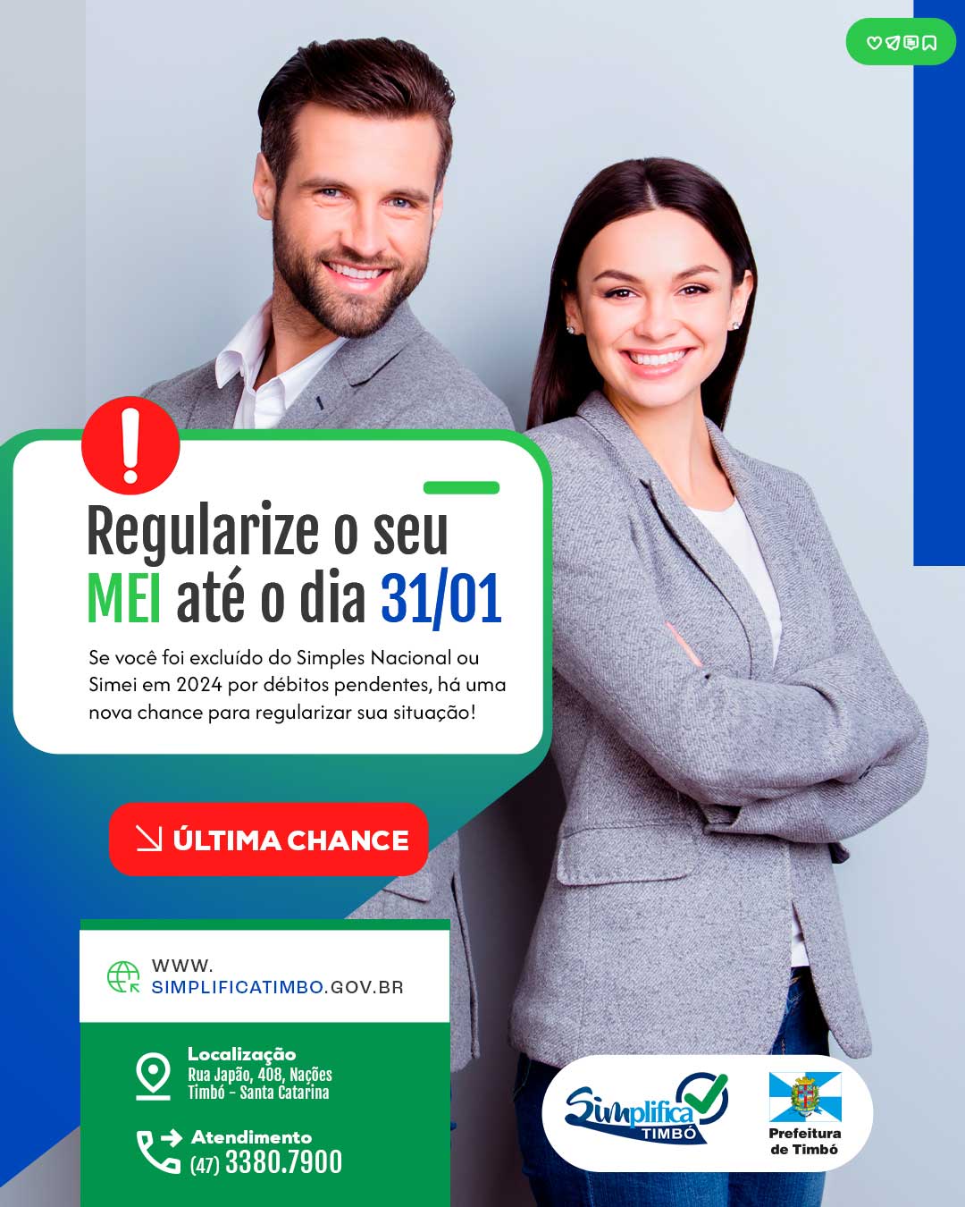 A Prefeitura de Timbó, por meio da Sala do Empreendedor, está realizando um chamamento aos Microempreendedores Individuais (MEIs) do município para regularizar sua situação e solicitar o reenquadramento no Simples Nacional. O prazo final para a regularização é 31 de janeiro de 2025.