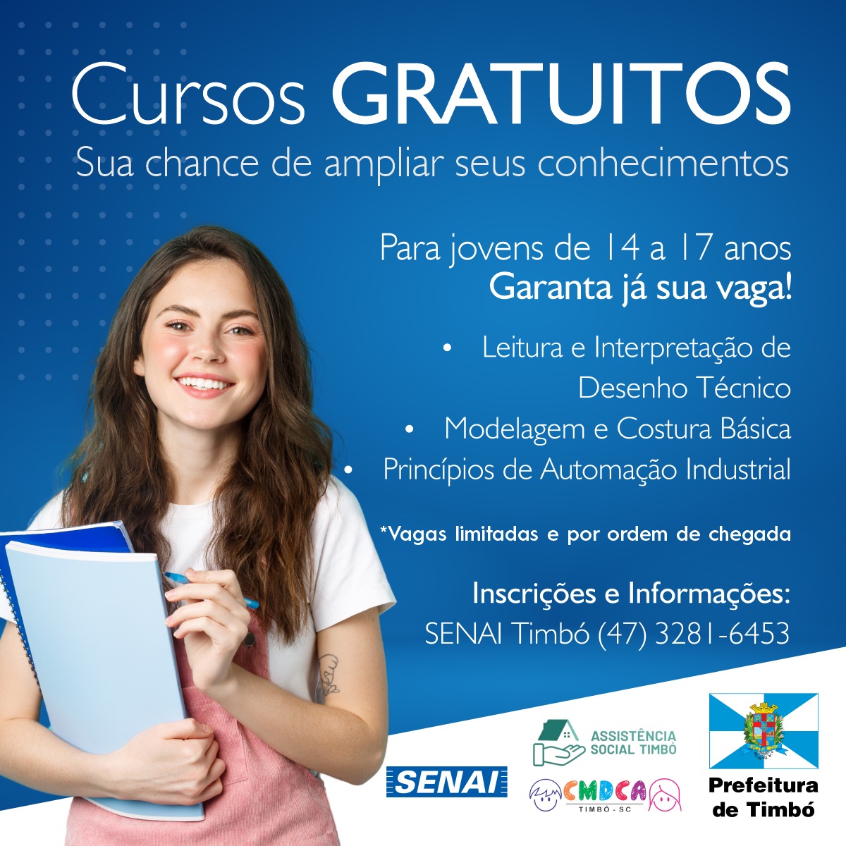 A Prefeitura de Timbó, através da Secretaria de Saúde e Assistência Social e Fundo Municipal da Infância e Adolescência (FIA), promove em parceria com o Senai, cursos gratuitos para jovens entre 14 e 17 anos.