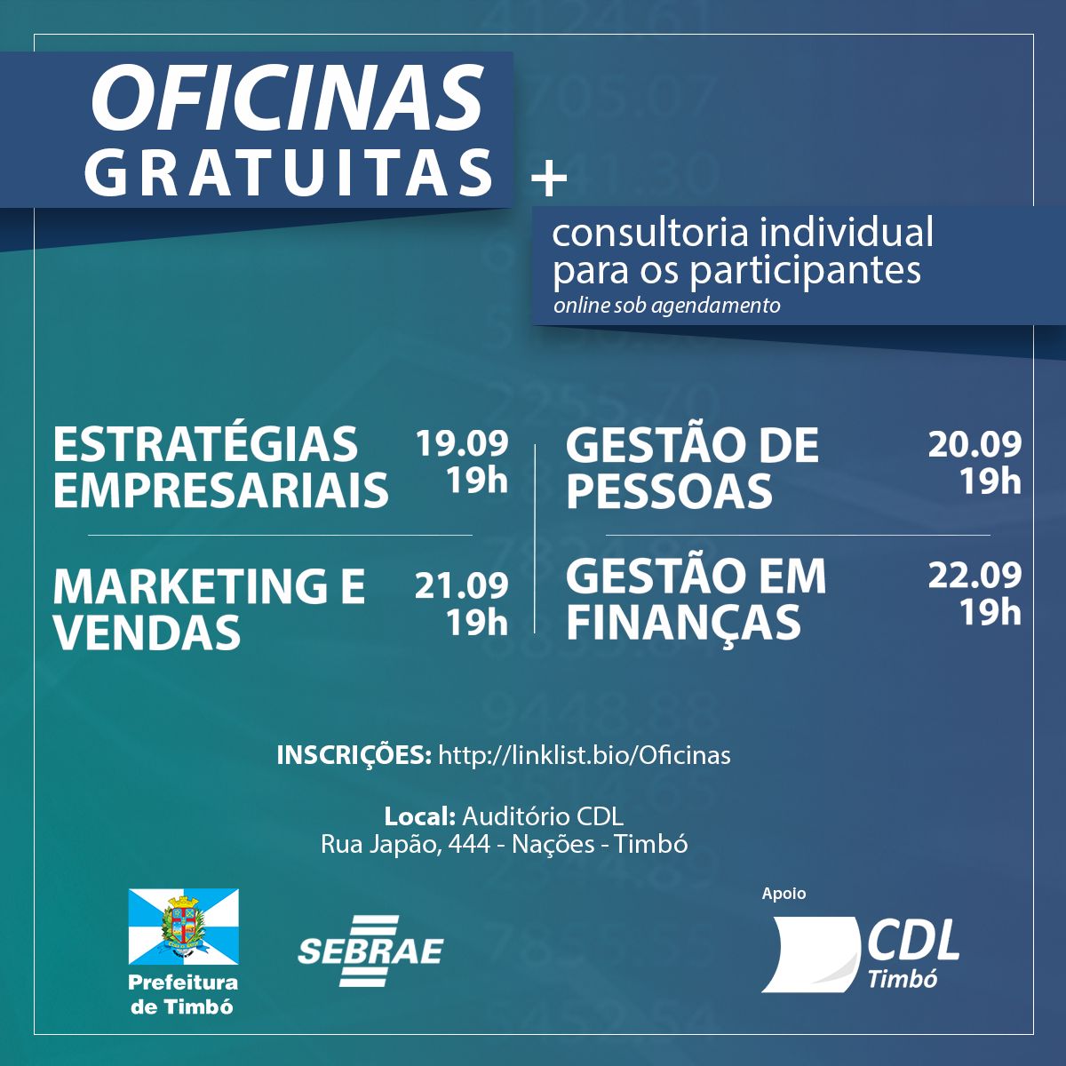 As oficinas acontecem no Auditório do CDL, na Rua Japão, 444. Além das oficinas, os participantes tem a oportunidade de receber uma consultoria individual e on-line de uma hora.