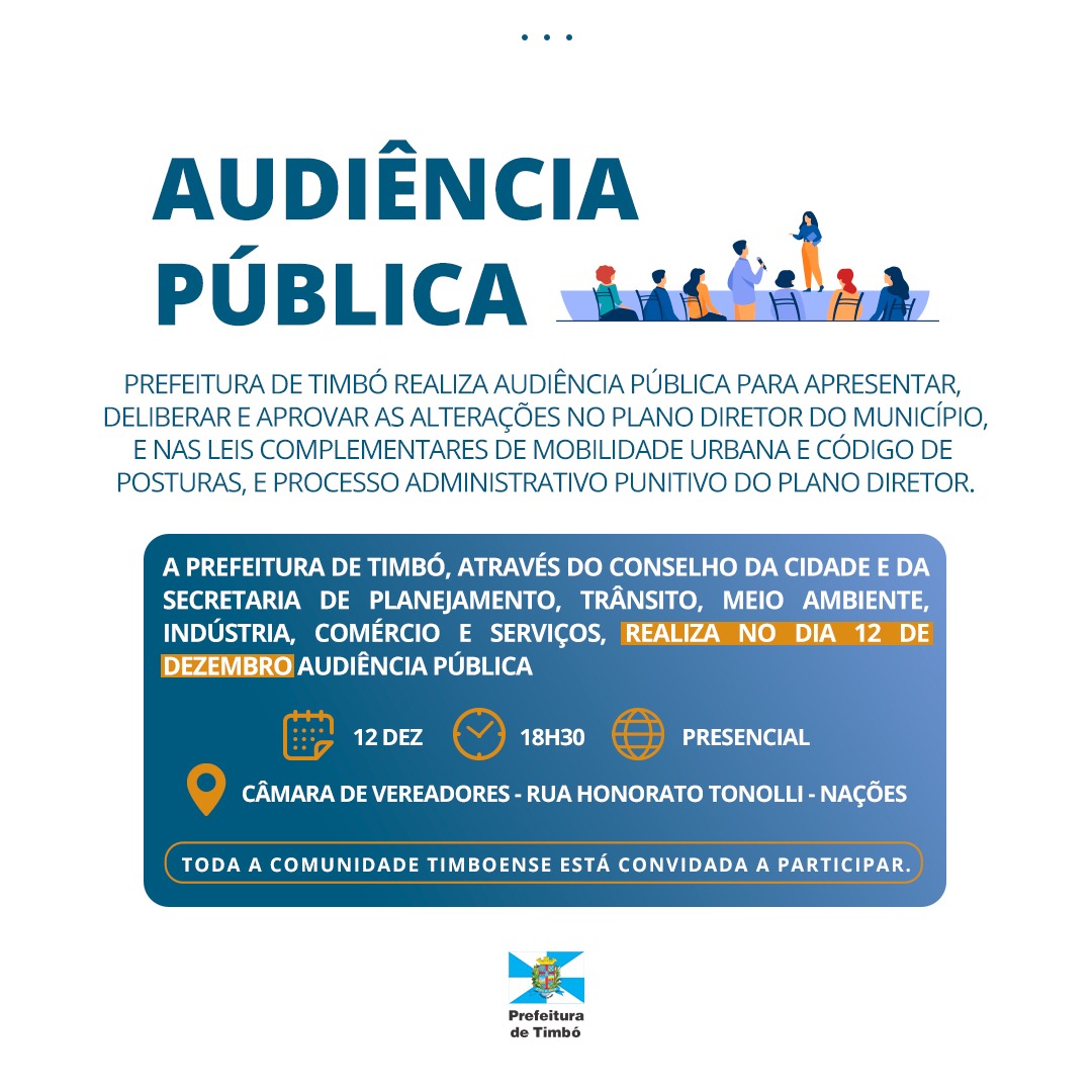 A Prefeitura de Timbó, através do Conselho da Cidade e da Secretaria de Planejamento, Trânsito, Meio Ambiente, Indústria, Comércio e Serviços, realiza no dia 12 de dezembro audiência pública para apresentar, deliberar e aprovar as alterações no Plano Diretor do Município(LC Nº 335/2007), assim como nas Leis Complementares: Lei Complementar de Mobilidade Urbana do Município de Timbó (Nº 478/2016), Código de Posturas do Município de Timbó (Nº 364/2008), e regulamentar o processo administrativo punitivo do Plano Diretor.