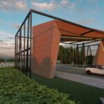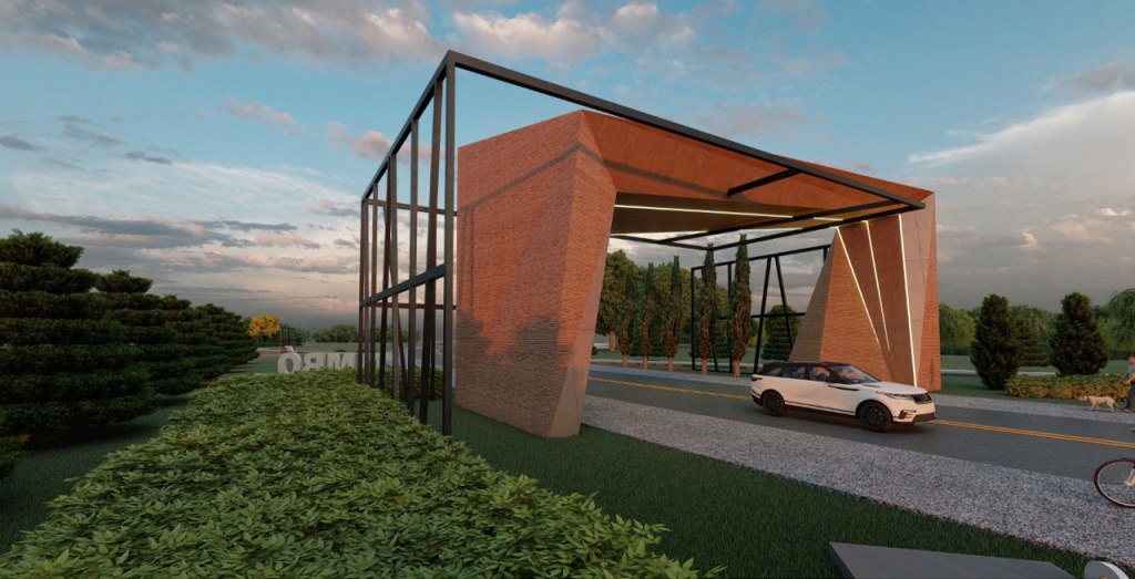 Portal Futurístico: Possui traços com linhas retas futurísticas, formas geométricas em ferro, que enaltecem a força das empresas metalúrgicas timboenses, e letreiros posicionados lateralmente.