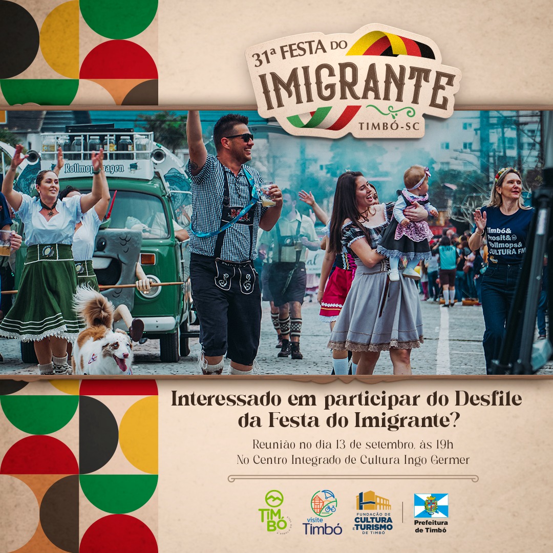 A Fundação de Cultura e Turismo de Timbó (FCTT) realizará nesta quarta-feira, dia 13 de setembro, uma reunião com os interessados em participar do Desfile Alusivo aos 154 anos de Timbó, que acontece no dia 12 de outubro e faz parte da programação da 31ª Festa do Imigrante.