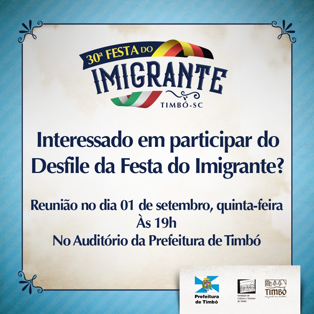 A Fundação de Cultura e Turismo de Timbó (FCTT) informa que na quinta-feira, dia 01 de setembro, realizará uma reunião com os interessados em participar do Desfile Alusivo aos 153 anos de Timbó, que acontece no dia 12 de outubro e faz parte da programação da 30ª Festa do Imigrante.