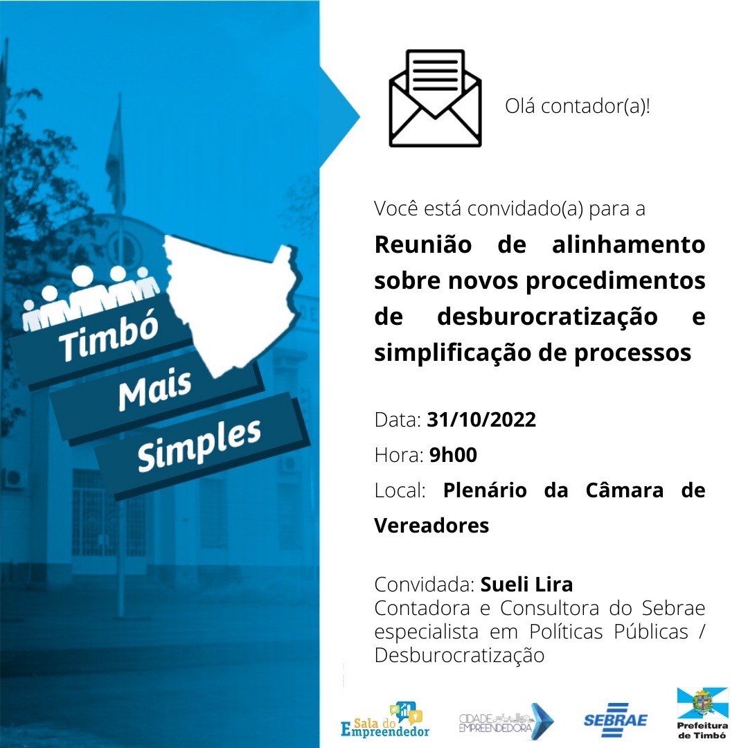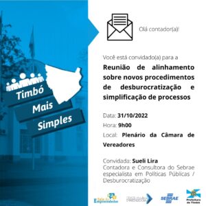 A Prefeitura de Timbó promove na segunda-feira, dia 31 de outubro, uma reunião de alinhamento sobre novos procedimentos de desburocratização e simplificação de processos relacionados à abertura, alteração e baixa de empresas em Timbó, considerando a aprovação e publicação da Lei Complementar nº 559/2022.