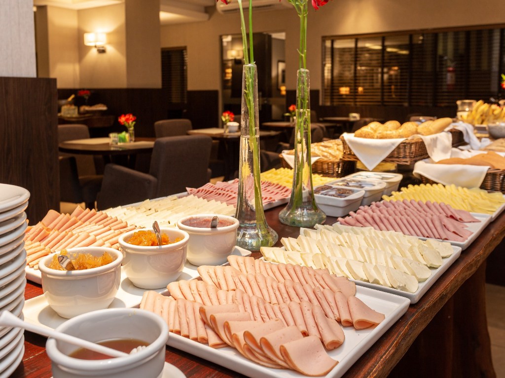 Entre os itens que não podem faltar estão os tradicionais ovos mexidos, cereais e frutas variadas. Além disso, delícias como queijos (um amarelo e um branco) e embutidos (presidente nyo, peito de peru, parma), variedade de pães e bolo.