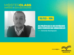 A partir das 19h desta quarta-feira, (15/02), acontece a primeira MasterClass UNIASSELVI de 2023. O professor Antonio Abatepaulo irá falar sobre o tema As práticas e os estágios dos cursos da UNIASSELVI. A transmissão é gratuita e por meio do canal da instituição no YouTube.