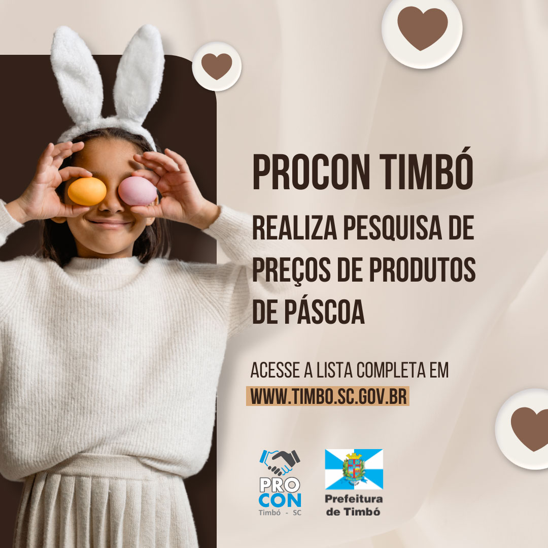 Acesse aqui a pesquisa completa: https://www.timbo.sc.gov.br/wp-content/uploads/2024/03/Pesquisa-de-Precos-Pascoa-2024-Procon-Timbo.pdf