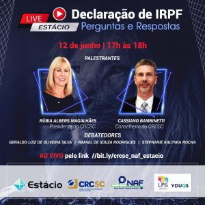 A Estácio promove na próxima sexta-feira (12/06) uma live para responder às principais dúvidas sobre o preenchimento e envio da Declaração do Imposto de Renda. O evento começa às 17h, na plataforma do Teams (//bit.ly/crcsc_naf_estacio) e terá como convidada a Presidente do Conselho Regional de Contabilidade de Santa Catarina, Rúbia Albers Magalhães.