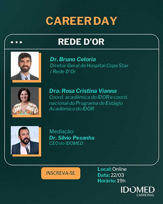 Estudantes da área da saúde e médicos que buscam atualização profissional poderão participar de uma palestra com especialistas da Rede D’or na próxima quarta-feira (22/03), às 19h. O objetivo do evento, promovido pelo Instituto de Educação Médica (IDOMED), é abordar os principais requisitos profissionais exigidos pelo mercado de trabalho na área da Saúde. Chamada de Career Day, a iniciativa é gratuita e aberta ao público. As inscrições poderão ser realizadas por meio do formulário: forms.office.com/r/u0Js2tECm3.