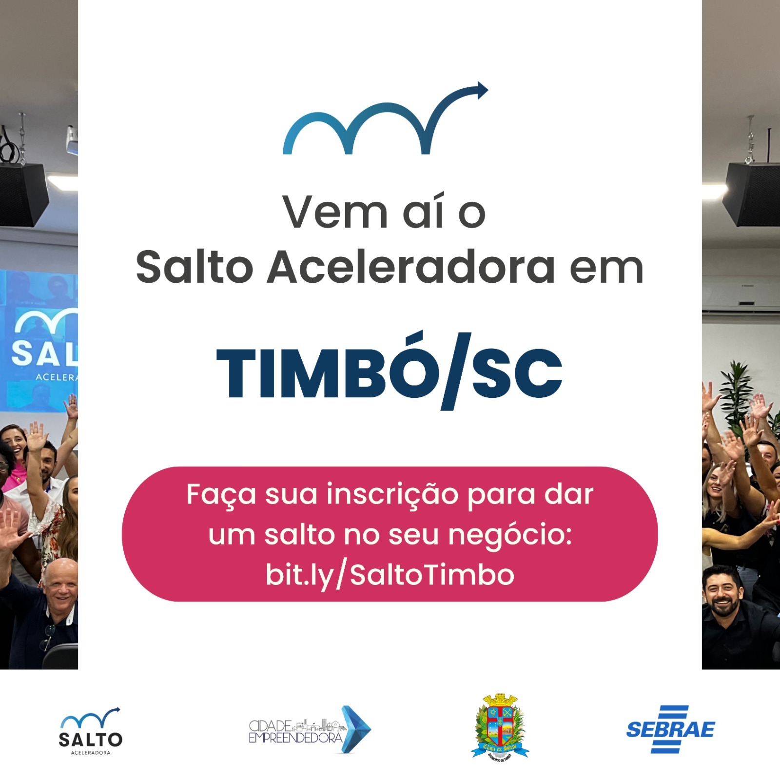 Estão abertas as inscrições para participar do maior programa de aceleração de Microempreendedores Individuais do Brasil — o Salto Aceleradora. A turma, que será realizada no formato presencial em Timbó, terá vagas limitadas e encontros semanais às quintas-feiras, nos quais os participantes vão aprender muito sobre ser empreendedor, gestão e crescimento de negócios. O programa é gratuito para os MEIs da cidade e a chegada desta turma é uma realização do Sebrae SC, da Prefeitura de Timbó e do Impact Hub Floripa.