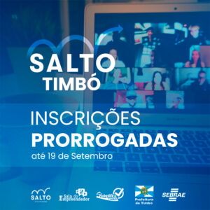 Realizado pela Prefeitura de Timbó em parceria com o Sebrae/SC, o Salto tem o objetivo de oportunizar capacitação empreendedora, focada no autodesenvolvimento do empreendedor e no crescimento do seu negócio. As inscrições, que inicialmente seriam até o dia 09 de setembro, foram prorrogadas até o dia 19 de setembro.