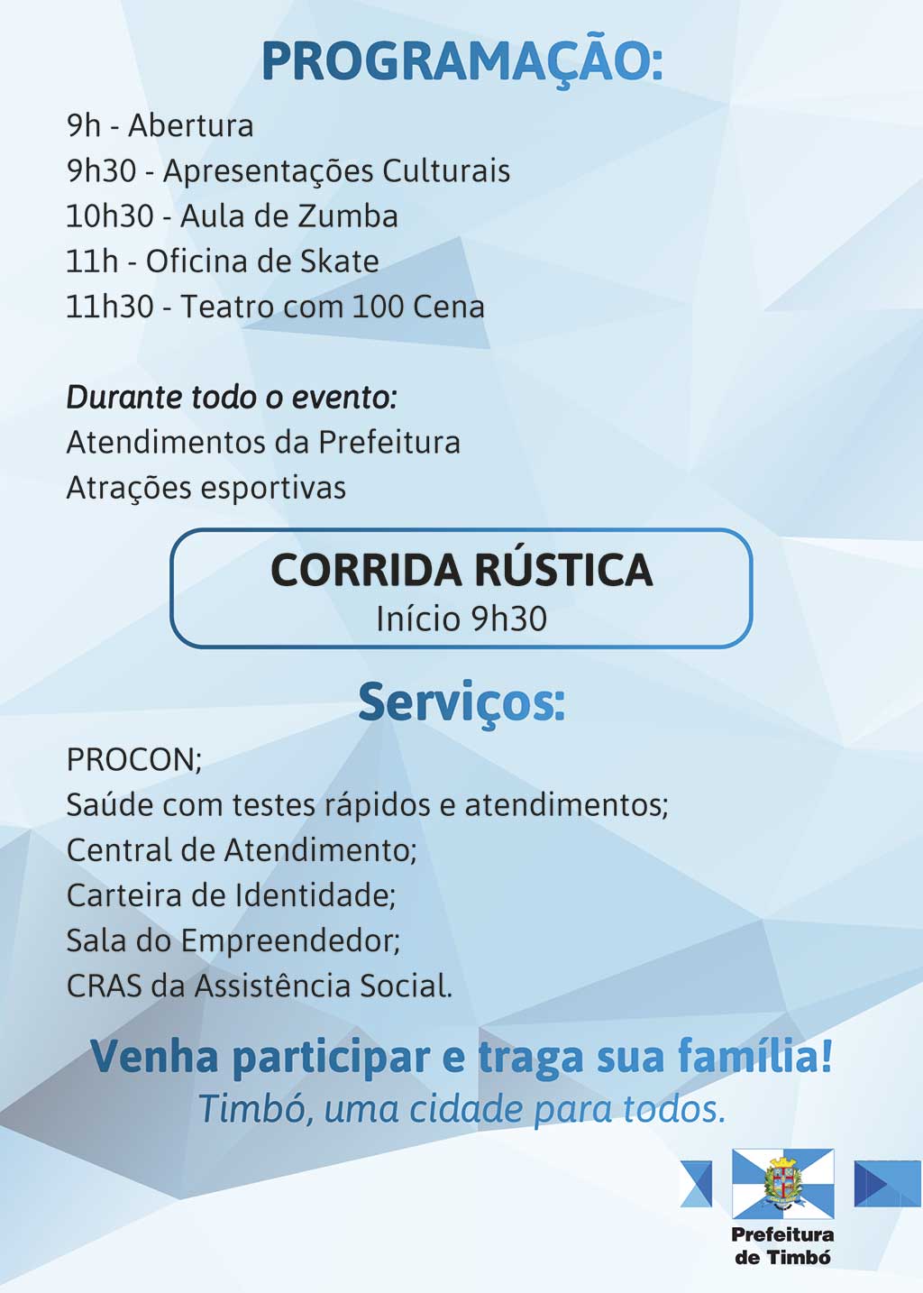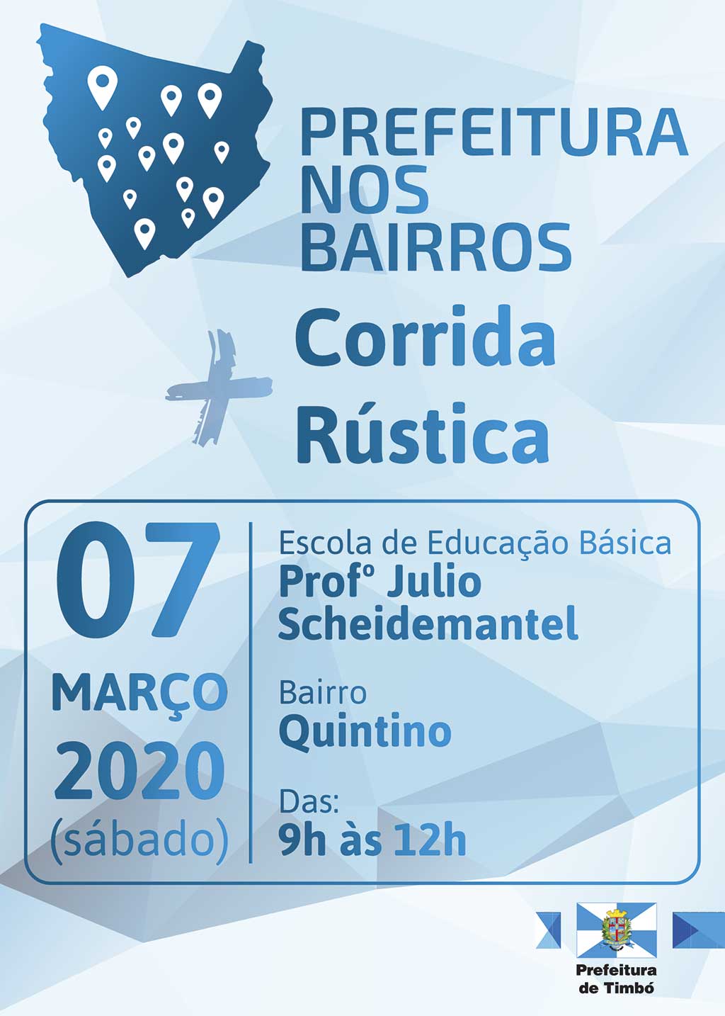 A partir deste mês de março o Programa Prefeitura nos Bairros volta a acontecer em Timbó, no Bairro Quintino. É a sétima edição do evento que aproxima a administração pública municipal da comunidade. Anteriormente, já receberam o programa os bairros Araponguinhas, Pe. Martinho Stein, São Roque, Pomeranos, Vila Germer e Tiroleses.