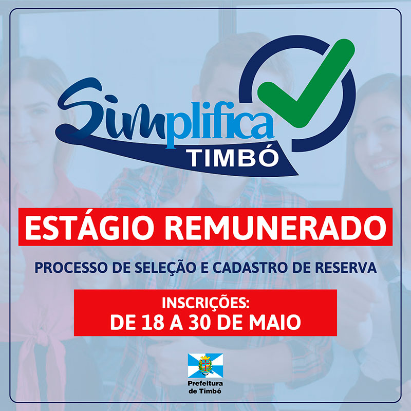 A Secretaria Municipal da Fazenda e Administração de Timbó torna público o edital para processo de seleção e cadastro de reserva para estágio remunerado para atuar no programa Simplifica Timbó.